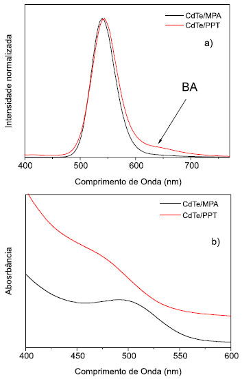 ![]() Figura 4. Comparaçao dos espectros de fotoluminescência (a) e Absorçao no UV-Vis (b) para CdTe/MPA e CdTe/PPT