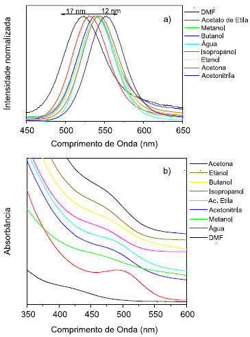 ![]() Figura 5. Espectros de Fotoluminescência (a) e de Absorçao no UV-Vis (b) dos PQs de CdTe/PPT em diferentes solventes. (Em água refere-se à dispersao de CdTe/MPA)