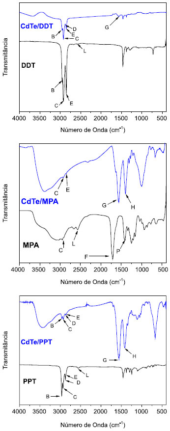 Com o intuito de se obter informações da interação PQ/LS após o processo de troca de ligantes, análises de IVTF foram realizadas e os resultados estão apresentados na Figura 6. Observou-se nos espectros de IVTF que após o procedimento de troca de ligantes as bandas G e H (atribuídas ao ânion carboxilato do ligante MPA) mantiveram-se inalteradas, o que indicou que a troca de ligante foi parcial e que os NCs de CdTe são estabilizados por ambos ligantes de superfície. As bandas B e D confirmam a presença do ligante PPT, uma vez que as mesmas são características do grupo CH3 (o ligante MPA não contém grupos CH3). Além disso, não foi observada a banda S-H presente nos ligantes puros, evidenciando que ambos os ligantes se conectam a partir da extremidade contendo o átomo de enxofre.