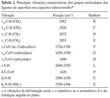 REFERÊNCIAS 1. Samanta, A.; Deng, Z.; Liu, Y.; Yan, H.; Nano Res. 2013, 6, 853. DOI: http://dx.doi.org/10.1007/s12274-013-0367-x 2. Zhang, J. Z.; Grant, C. D.; Annual Review of Nano Research, Vol. 2, 1st ed., World Scientific: Singapore, 2008, cap. 1. 3. Kamat, P. V.; J. Phys. Chem. Lett. 2013, 4, 908. DOI: http://dx.doi.org/10.1021/jz400052e 4. Park, J.; Joo, J.; Kwon, S. G.; Jang, Y.; Hyeon, T.; Angew. Chem. Int. Ed. 2007, 46, 4630. DOI: http://dx.doi.org/10.1002/anie.200603148 5. Cheki, M.; Moslehi, M.; Assadi, M.; Eur. Rev. Med. Pharmacol. Sci. 2013, 17, 1141. PMID: 23690181 6. Mattoussi, H.; Radzilowski, L. H.; Dabbousi, B. O.; Thomas, E. L.; Bawendi, M. G.; Rubner, M. F.; J. Appl. Phys. 1998, 83, 7965. 7. Zhang, Y.; Clapp, A.;Sensors 2011, 11, 11036. DOI: http://dx.doi.org/10.3390/s111211036 8. Silva, F. O.; Viol, L. C. S.; Ferreira, D. L.; Alves, J. L. A.; Schiavon, M. A.; Quim. Nova 2010, 33, 1933. DOI: http://dx.doi.org/10.1590/S0100-40422010000100025 9. Murray, C. B.; Norris, D. J.; Bawendi, M. G.; J. Am. Chem. Soc. 1993, 115, 8706. DOI: http://dx.doi.org/10.1021/ja00072a025 10. Gaponik, N.; Talapin, D. V.; Rogach, A. L.; Hoppe, K.; Shevchenko, E. V.; Kornowski, A.; Eychmüller, A.; Weller, H.; J. Phys. Chem. B 2002, 106, 7177. DOI: http://dx.doi.org/10.1021/jp025541k 11. Erathodiyil, N.; Ying, J.; Acc. Chem. Res. 2011, 44, 925. DOI: http://dx.doi.org/10.1021/ar2000327 PMID: 21648430 12. Gao, M.; Kirstein, S.; Mohwald, H.; Rogach, A. L.; Kornowski, A.; Eychmuller, A.; Weller, A.; J. Phys. Chem. B 1998, 102, 8360. DOI: http://dx.doi.org/10.1021/jp9823603 13. Peng, Z. A.; Peng, X.; J. Am. Chem. Soc. 2001, 123, 183. DOI: http://dx.doi.org/10.1021/ja003633m PMID: 11273619 14. Impellizzeri, S. McCaughan, B.; Callan, J. F.; Raymo, F. M.; J. Am. Chem. Soc. 2012, 134, 2276. DOI: http://dx.doi.org/10.1021/ja209873g PMID: 22217330 15. Leung, K.; Whaley K. B.; J. Chem. Phys. 1999, 110, 11012. DOI: http://dx.doi.org/10.1063/1.479037 16. Hill, N. A.; Whaley, K. B.; J. Chem. Phys. 1994, 100, 2831. DOI: http://dx.doi.org/10.1063/1.466477 17. Fu, H. X.; Zunger, A.; Phys. Rev. B: Condens. Matter Mater. Phys. 1997, 56, 149. 18. Wang, L. L.; Jiang, J. S.; J. Nanopart. Res. 2011, 13, 1301. DOI: http://dx.doi.org/10.1007/s11051-010-0124-y 19. Pilla, V.; Munin, E.; J. Nanopart. Res. 2012, 14, 1147. DOI: http://dx.doi.org/10.1007/s11051-012-1147-3 20. Lin, W.; Zou, W.; Du, Z.; Li, H.; Zhang, C.; J. Nanopart. Res. 2013, 15, 1629. DOI: http://dx.doi.org/10.1007/s11051-013-1629-y 21. Weiss, E. A.; Acc. Chem. Res. 2013, 46, 2607. DOI: http://dx.doi.org/10.1021/ar400078u PMID: 23734589 22. Silva, F. O.; Dissertaçao de Mestrado, Universidade Federal de Sao Joao del-Rei, Brasil, 2011. 23. Rogach, A. L.; Talapin, D. V.; Gaponik, N.; Eychmuller, A.; Weller, H.; Nano Lett. 2002, 2, 803. DOI: http://dx.doi.org/10.1021/nl025662w 24. Rogach, A. L.; Franzl, T.; Klar, T. A.; Feldmann, J.; Gaponik, N.; Lesnyak, V.; Shavel, A.; Eychmuller, A.; Rakovich, Y. P.; Donegan, J. F.; J. Phys. Chem. C 2007, 111, 14628. DOI: http://dx.doi.org/10.1021/jp072463y 25. Pradhan, N.; Reifsnyder, D.; Xie, R.; Aldana, J.; Peng, X.; J. Am. Chem. Soc. 2007, 129, 9500. DOI: http://dx.doi.org/10.1021/ja0725089 PMID: 17622147 26. Ji, X.; Copenhaver, D.; Sichmeller, C.; Peng, X.; J. Am. Chem. Soc. 2008, 130, 5726. DOI: http://dx.doi.org/10.1021/ja710909f PMID: 18396878 27. Banerjee, S.; Kar, S.; Perez, J. M.; Santra, S.; J. Phys. Chem. C 2009, 113, 9659. DOI: http://dx.doi.org/10.1021/jp9019574 28. Silva, F. O.; Carvalho, M. S.; Mendonça, R.; Macedo, W. A. A.; Balzuweit, K.; Reiss, P.; Schiavon, M. A.; Nanoscale Res. Lett. 2012, 7, 536. DOI: http://dx.doi.org/10.1186/1556-276X-7-536 PMID: 23017183 29. Fang, T.; Ma, K.; Ma, L.; Bai, J.; Li, X.; Song, H.; Guo, H.; J. Phys. Chem. C 2012, 116, 12346. DOI: http://dx.doi.org/10.1021/jp302820u 30. Tamang, S.; Beaune, G.; Texier, I.; Reiss, P.; ACS Nano 2011, 5, 9392. DOI: http://dx.doi.org/10.1021/nn203598c PMID: 22035355 31. Anderson, N. C.; Hendricks, M. P.; Choi, J. J.; Owen, J. S.; J. Am. Chem. Soc. 2013, 135, 18536. DOI: http://dx.doi.org/10.1021/ja4086758 PMID: 24199846 32. Debnath, S.; Cherian, R.; Mahadevan, P.; J. Phys. Chem. C 2013, 117, 21981. DOI: http://dx.doi.org/10.1021/jp401798y 33. Viol, L. C. S.; Silva, F. O.; Ferreira, D. L.; Alves, J. L. A.; Schiavon, M. A.; Quim. Nova 2011, 34, 595. DOI: http://dx.doi.org/10.1590/S0100-40422011000400008 34. Ding, J.; Wang, X.; Zhuo, L.; Tang, B.; J. Mater. Chem. 2009, 19, 3027. DOI: http://dx.doi.org/10.1039/b819230h 35. Martin, M. N.; Basham, J. I.; Chando, P.; Eah, S.; Langmuir 2010, 26, 7410. DOI: http://dx.doi.org/10.1021/la100591h PMID: 20392108 36. Yu, W. W.; Qu, L.; Guo, W.; Peng, X.; Chem. Mater. 2003, 15, 2854. DOI: http://dx.doi.org/10.1021/cm034081k 37. Viol, L. C. S.; Dissertaçao de Mestrado, Universidade Federal de Sao Joao del-Rei, Brasil, 2011. 38. Li, H.; Tese de Doutorado, Drexel University, Estados Unidos, 2008. 39. Poznyak, S. K.;. Osipovich, N. P.; Shavel, A.; Talapin, D. V.; Gao, M.; Eychmuller, A.; Gaponik, N.; J. Phys. Chem. B 2005, 109, 1094. DOI: http://dx.doi.org/10.1021/jp045650u PMID: 16851065 40. Borchert, H.; Talapin, D. V.; Gaponik, N.; McGinley, C.; Adam, S.; Lobo, A.; Möller, T.; Weller, H.; J. Phys. Chem. B 2003, 107, 9662. DOI: http://dx.doi.org/10.1021/jp0352884 41. Silverstein, R. M; Bassler, G. C; Morril, T. C.; Indentificaçao espectrométrica de compostos orgânicos, 5º ed., Guanabara Koogan: Rio de Janeiro, 1994. 42. Zhang, T.; Sun, X.; Liu, B.; Spectrochim. Acta, Part A 2011, 79, 1566. DOI: http://dx.doi.org/10.1016/j.saa.2011.05.014 43. Heurtault, B.; Saulnier, P.; Pech, B.; Proust, J. E.; Benoit, J. P.; Biomaterials 2003, 24, 4283. DOI: http://dx.doi.org/10.1016/S0142-9612(03)00331-4 44. Kitahara, A.; Prog. Org. Coat. 1973, 2, 81. DOI: http://dx.doi.org/10.1016/0300-9440(73)80001-3 45. McGown, D. N. L.; Parfitt, G. D.; Willis, E.; J. Colloid Sci. 1965, 20, 650. DOI: http://dx.doi.org/10.1016/009