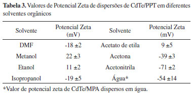 De acordo com a Figura 4a, constatou-se que os espectros de fotoluminescência do CdTe/MPA e CdTe/PPT, após a troca de ligantes, não alteraram significativamente suas propriedades espectroscópicas. No entanto, verificou-se a ocorrência de um sutil aumento na largura da banda de emissão, além do surgimento da banda de armadilha (BA), que conduz a um aumento na densidade de estados de armadilha na superfície dos NCs.23,34 Por outro lado, o espectro de absorção do CdTe/PPT apresentou um deslocamento da principal banda de absorção para menores comprimentos de onda, quando comparado ao espectro do CdTe/MPA (Figura 4b), provavelmente devido à interação entre o solvente orgânico e os ligantes. Deslocamentos nas bandas de absorção e emissão de PQs após a troca de ligantes têm sido explicados devido às diferenças nas constantes dielétricas e interação do solvente com os ligantes de superfície.30 Entretanto, o produto obtido a partir da troca de ligantes (CdTe/MPA para CdTe/PPT) apresentou estabilidade em meio orgânico (hexano) por apenas dois dias, precipitando-se após esse período. A fim de avaliar o melhor solvente para dispersar os PQs de CdTe/PPT, análises de potencial Zeta em diferentes solventes orgânicos foram realizadas. Os resultados estão representados na Tabela 3.