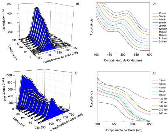 Figura 1. Evoluçao temporal da síntese: a) Espectro de emissao do CdTe/MPA ( λexc = 355 nm) b) Espectro de absorçao UV-Vis do CdTe/MPA c) Espectro de emissao do CdTe/MEA ( λexc = 470 nm) d) Espectro de absorçao UV-Vis do CdTe/MEA