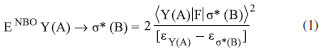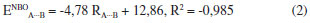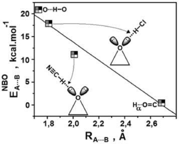 É proibitivo, neste momento, afirmar que esta energia de interação deve ser completamente resguardada à ligação de hidrogênio O···H-O. Assim, a determinação do quinhão energético equivalente a O···H-O e Hα1···O=C e Hα2···O=C não pode ser feito pelo critério da supermolécula. Na análise NBO, a energia de interação é obtida conforme a equação (1):104 ![]() na qual 2 indica a ocupação (2 elétrons) no orbital doador, |F| é a matriz de Fock, εY(A) - εYσ*(B) corresponde a diferença de energia entre os orbitais,35 A e B representam os pares de elétrons (LP, do inglês lone pair) do receptor (C2H4O) e o orbital antiligante da ligação sigma (BD*(1)) Hβ-O do doador de próton (HO2CH), respectivamente. Na Tabela 5 são listadas as energias de interação NBO para as ligações de hidrogênio: ENBOO···H-O (LP···BD*(1), ENBOHα1···O=C(BD*(1)···LP) e ENBOHα2···O=C(BD*(1)···LP). Em alguns sistemas, a força de interação medida por estas energias NBO apresentam uma relação bem estabelecida com as distâncias de interação.105 Na Figura 5, a relação entre os valores das energias ENBOA···B e as distâncias intermoleculares RA···B apresenta um perfil linear com coeficiente de correlação R2 de -0,985 representado pela equação (2): ![]()