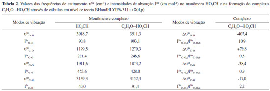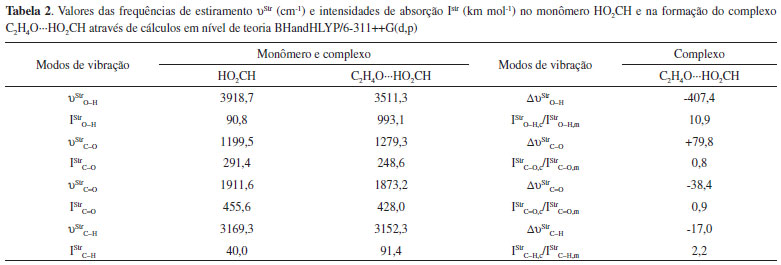 Inicialmente, os resultados de 2,686 Å e 2,689 Å indicam que as interações Hα1···O=C e Hα2···O=C são mais curtas 0,034 e 0,031 Å em comparação com a soma dos raios de van der Waals de 1,20 Å e 1,50 Å para oxigênio e hidrogênio,79 cujo valor é 2,70 Å. Embora seja de natureza empírica,80 este é um requisito obrigatório para a formação de ligação de hidrogênio.81 Entretanto, a interação O···H-O é 0,987 Å mais curta em comparação ao valor tabelado de 2,70 Å. Isto indica que o complexo C2H4O···HO2CH é formado e estabilizado principalmente pela ação da ligação de hidrogênio principal O···H-O ao invés das secundárias Hα1···O=C e Hα2···O=C. Embora os valores de distâncias intermoleculares compreendidos entre 1,70-1,75 Å esboçam que o sistema possa apresentar uma interação parcialmente covalente,25 a força de interação em O···H-O é compatível ao complexo C2H4O···HF em cuja distância O···H-F de 1,70 Å82 apresenta uma energia considerada moderada de -31,20 kJ mol-1.25,83 Na formação do complexo intermolecular, muitas são as deformações em sua estrutura, conforme mostram os valores em parênteses listados na Tabela 1. Dentre todas as ligações no ácido fórmico, H-O é aquela que sofreu a maior variação, cujo valor é 0,020 Å. Naturalmente que esta variação tenha sido provocada por O···H-O, que é a ligação de hidrogênio mais curta. Em contrapartida, a distância da ligação C-O, no ácido fórmico, é reduzida em 0,016 Å, cujo valor não pode ser diretamente associado com a força da ligação de hidrogênio O···H-O. Com relação às demais ligações, C=O e C-H no ácido fórmico ou C-Hα no heteroanel, estas sofreram variações mais amenas. Corroborando com os resultados estruturais, na Tabela 2 são apresentados os valores das frequências de estiramento (υstr) e intensidades de absorção (Istr) dos modos normais relacionados as vibrações das ligações do ácido fórmico, como também os efeitos blue-shift e red-shift (Δυstr) juntamente com as proporções de absorção (Istr,c/Istr,m) do complexo (c) em relação ao monômero (m). Ao contrário dos trabalhos que mostram uma relação linear direta entre os valores de Δυstr e as variações nas distâncias de ligação (Δr),84 a Figura 2 exibe um perfil de tendência.85-88 Por exemplo, a redução de 0,016 Å na distância rC-O está associada com o efeito blue-shift de +79,8 cm-1, indicando um fortalecimento de ligação.89-92 Ademais, o enfraquecimento nas ligações H-O, C=O e C-H podem ser interpretados conforme os incrementos de 0,020; 0,009 e 0,001 Å em total concordância com os valores red-shifts de -407,4; -38,4 e -17,0 cm-1.93-98 Analisando a Figura 3, entre estes efeitos red-shifts, o valor de -407,4 cm-1 na ligação H-O é equivalente aos observados em sistemas fortemente ligados,37 reforçando o argumento de que a estabilidade do complexo C2H4O···HO2CH deve resultar de uma ligação de hidrogênio com alta energia, a O···H-O.