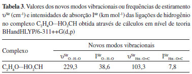 Na Tabela 3 são organizados os valores dos novos modos vibracionais ou frequências de estiramento das ligações de hidrogênio seguido pelas respectivas intensidades de absorção. Em total concordância com os valores de distância, a frequência de estiramento da ligação de hidrogênio O···H-O é muito maior em comparação ao valor das interações secundárias Hα···O=C, as quais apresentam leves diferentes distâncias (2,686 e 2,689 Å) embora um único modo vibracional de 103,3 cm-1 com a intensidade de absorção de 7,8 km mol-1 praticamente imperceptível no espectro de infravermelho (Figura 3). A respeito da ligação O···H-O, sua intensidade de 38,6 km mol-1 a torna mais evidente nas regiões de baixa energia vibracional. Mesmo assim, sua frequência de estiramento de 229,3 cm-1 é equivalente aos novos modos vibracionais de complexos heterocíclicos fortemente tensionados82 como também muito superior a de sistemas p fracamente ligados.89,90,93-95