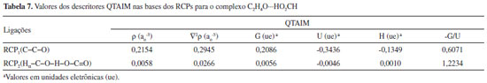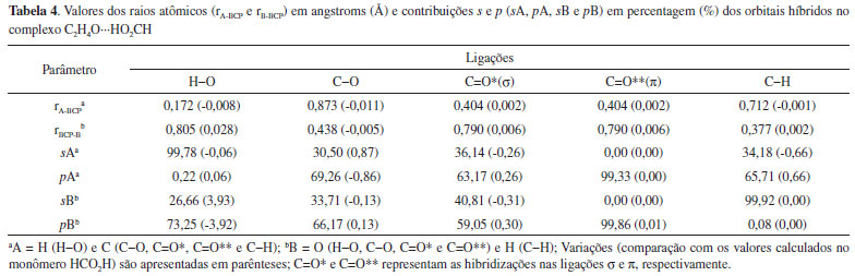 Análise NBO e raios QTAIM Nesta etapa do trabalho, a grande questão está na interpretação teórica dos deslocamentos de frequência red-shift e blue-shift manifestados nas ligações C-O, C=O e C-H, mas também no centro doador de próton O-H. Recentemente, uma relação entre as contribuições s e p dos orbitais híbridos e as variações nas frequências de estiramento foi documentada tendo como argumento principal o fato de que o efeito blue-shift no doador de próton H-X é justificado pelo aumento no caráter s do elemento X no orbital híbrido.35,99 Embora esta visão da retropolarizabilidade em H-X seja respaldada pela regra de Bent,100 também pode ser aplicada para as frequências com red-shifts caso hajam uma diminuição e aumento nos caráteres s e p de X no orbital híbrido. De acordo com os valores das percentagens nas variações nos orbitais híbridos listados na Tabela 4, infelizmente a correlação entre os deslocamentos de frequência (Tabela 2) não foi estabelecida com êxito.101 Na ligação C-O, a variação do caráter s do oxigênio no orbital híbrido apresenta um valor de -0.13%. Sendo o oxigênio o átomo pesado da ligação, este valor não se correlaciona com o efeito blue-shift de +79,8 cm-1 (Figura 4), invalidando a regra de Bent.35,100 Inconsistência similar pode ser observada na diminuição de -3,92 % no valor de pB (B = oxigênio) na ligação H-O, em que acarreta uma menor polaridade que não condiz com o efeito red-shift de -407,4 cm-1.