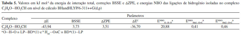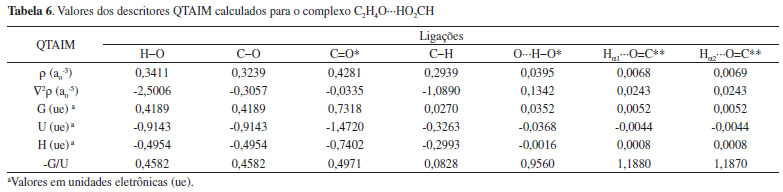 Excepcionalmente, a polaridade da ligação C=O foi realçada pelo valor de 0,30 de pB, embora referente apenas a parte sigma (σ). A porção π não apresentou resultados que justificassem a polarização e o efeito red-shift de -38,4 cm-1. Em termos de QTAIM, o efeito red-shift contemplado pela diminuição do caráter s em sinergia com o aumento no caráter p no orbital híbrido deve consistir em um incremento proporcional no raio atômico de X da ligação do doador de próton H-X (X = Cl, F, O, N, P e elétrons π)25,33,36-39,68,69,101,102 como se segue: ΔrX > ΔrH. A variação do raio QTAIM ratifica a penetração de um átomo em direção ao BCP ao longo do eixo internuclear, neste caso de H-X. De acordo com os resultados apresentados na Tabela 4, na ligação H-O os raios dos átomos de oxigênio e hidrogênio aumentam e reduzem em 0,028 e 0,008 Å, respectivamente. Estes valores estariam em concordância com a teoria de hibridização caso houvesse uma redução no caráter s do oxigênio, o que infelizmente não ocorre. Entretanto, na ligação C=O pode ser observado um aumento no raio do oxigênio em relação ao carbono, cujos valores são 0,006 e 0,002 Å, respectivamente. Este perfil isolado concorda perfeitamente com o efeito red-shift de -38,4 cm-1, bem como com o aumento no caráter p do átomo de oxigênio. Energia e descritores QTAIM A energia de estabilização do complexo C2H4O···HO2CH pode ser interpretada pela aproximação de supermolécula: ΔE = E(C2H4O···HO2CH) - E(C2H4O) - E(HO2CH).103 O valor de ΔEC de -36,70 kJ mol-1 (ΔEC = ΔE + BSSE + ΔZPE: corrigido com os valores de 3,73 e 3,51 kJ mol-1 referentes ao cálculo de BSSE e dados de ZPE, respectivamente) apresentado na Tabela 5 pode ser considerado elevado, fato este já esperado uma vez que a distância de 1,733 Å da ligação de hidrogênio O···H-O é muito curta.