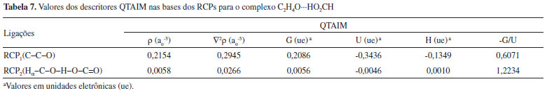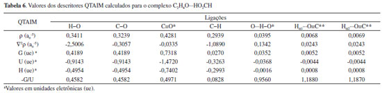 Não obstante, o teorema virial QTAIM que relaciona as contribuições cinéticas e potenciais por meio do termo da densidade eletrônica total (H) indica qualitativamente o perfil da força de interação. Pelos valores de -0,0016 e 0,0008 ue, na ligação de hidrogênio O···H-O há uma prevalência de energia potencial em comparação com a cinética ao passo que nas interações secundárias Hα1···O=C e Hα2···O=C o termo cinético é preponderante. Além disso, o valor de 0,9560 relacionado à razão -G/U está na faixa compreendida entre 0,5 e 1,0. Isto indica que a ligação de hidrogênio O···H-O apresenta um caráter parcialmente covalente,25,37,91 como já havia sendo previsto pelos resultados de distância de ligação e efeito red-shift. Ao revés, o valor de 1,188 e 1,187 caracterizam ambas Hα1···O=C e Hα2···O=C como interações essencialmente não covalentes.107