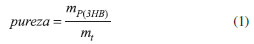 Cinética de extração com carbonato de propileno Estudou-se a cinética de extração de P(3HB) com o solvente na temperatura de aquecimento de 130 e 150 ºC. Para cada uma das temperaturas 4 ensaios foram realizados, com tempos de contato das células com o solvente de 5, 15, 30 e 45 min, empregando-se 11,5 g de células para 75 mL de solvente (relação células/solvente de 0,15 g mL-1). A metodologia de extração utilizada foi de acordo com a descrita anteriormente, com os tempos de repouso 1 e 2, de 12 h cada, e volume de 200 mL de água destilada para lavagem do P(3HB) na segunda filtração. Determinação de P(3HB) A concentração de P(3HB) nas amostras de polímero extraído foi determinada por cromatografia gasosa (CG-90 equipado com uma coluna de sílica fundida, Supercowax-10 - 0,53 mm x 30 m, e detector de ionização de chama), conforme o método de metanólise.16 Para a determinação da porcentagem de pureza do P(3HB) extraído, utilizou-se a Equação 1. ![]() na qual: mP(3HB) = massa de biopolímero detectada por cromatografia (g); mt = massa total do polímero utilizada para a análise cromatográfica (g). A partir da porcentagem de pureza do P(3HB) extraído, foi possível determinar a porcentagem de recuperação por meio da Equação 2. ![]() na qual: mp = massa de P(3HB) puro (g) = mf * pureza; mf = massa de P(3HB) obtido após a recuperação (g); mi = massa total de P(3HB) nas células antes da extração. Caracterização do P(3HB) extraído com carbonato de propileno Espectroscopia na região do infravermelho com transformada de Fourier (FT-IR) A identificação do P(3HB) foi realizada pela caracterização dos grupamentos funcionais do biopolímero extraído, por meio da espectroscopia na região do infravermelho (FTIR), em equipamento Perkin Elmer Spectrum 100 IR, no intervalo de 4000 a 400 cm-1, pela técnica de refletância difusa. Análise termogravimétrica (TGA) Análise termogravimétrica foi utilizada para avaliar a degradação térmica do biopolímero extraído, sendo possível obter a temperatura de início de degradação (Ti), a temperatura máxima de degradação (Tpico) e a porcentagem de perda de massa do P(3HB) extraído. A análise foi realizada em TGA-50 Shimadzu. As amostras foram aquecidas de 25 a 500 ºC a uma velocidade de aquecimento de 10 ºC min-1, sob atmosfera de nitrogênio. Calorimetria diferencial de varredura (DSC) As medidas de DSC foram realizadas utilizando-se equipamento DSC-50 Shimadzu para caracterizar o biopolímero quanto à temperatura de fusão (Tm), temperatura de transição vítrea (Tg) e grau de cristalinidade (Xc). A amostra foi aquecida sob atmosfera inerte (nitrogênio) de -30 ºC a 200 ºC a 10 ºC min-1 no primeiro aquecimento e o segundo aquecimento foi realizado de -50 ºC a 200 ºC a 10 ºC min-1. A cristalinidade (Xc) do polímero foi determinada a partir da relação entre a entalpia de fusão da amostra (ΔHm) e a entalpia de fusão de P(3HB) 100% cristalino, 142 J g-1.17 Cromatografia de permeação em gel (GPC) A análise de GPC foi realizada para a determinação da massa molar do P(3HB) extraído. O equipamento utilizado para a análise foi um HPLC Waters Instruments equipado com bomba isocrática, modelo 1515, detector por índice de refração, modelo 2414; temperatura do detector de 35 ºC, quatro colunas de permeação em gel Waters Styragel (7,8 x 300 mm) em THF ligadas em série com faixa de exclusão de 100 a 5000 (HR1), 500 a 20000 (HR2), 500 a 30000 (HR3), e 5000 a 500000 (HR4), temperatura da coluna de 40 ºC. Clorofórmio foi utilizado como solvente na fase móvel e o eluente da coluna foi o Tetraidrofurano (THF). Para a calibração do sistema, foram utilizados padrões de poliestireno (PS) com massas molares de 400, 950, 2800, 6400, 17000, 43000, 110000 e 430000 Da. As amostras de P(3HB) foram diluídas na razão de 5 mg mL-1 de clorofórmio e mantidas em repouso durante 24 h para a total dissolução do polímero no solvente. O volume de injeção foi de 200 µL, sob fluxo de solvente constante de 1 mL min-1.