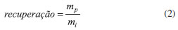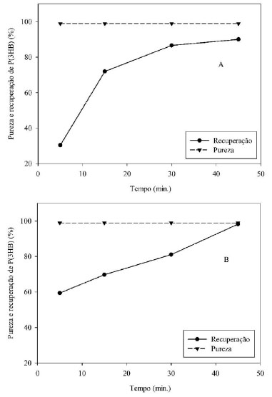 ![]() Figura 1. Porcentagens de recuperação e pureza de P(3HB), produzido por C. necator, obtidas nas cinéticas de recuperação com carbonato de propileno a 130 °C (A) e 150 ºC (B) nos tempos de 5, 15, 30 e 45 min