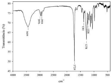 ![]() Figura 2. Espectro de FT-IR para o P(3HB) extraído de Cupriavidus necator utilizando carbonato de propileno, nas condições de extração a 150 °C durante 45 min