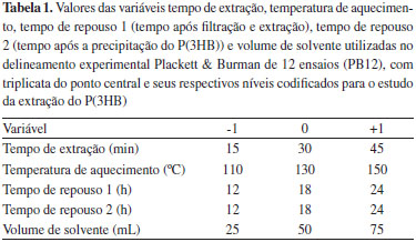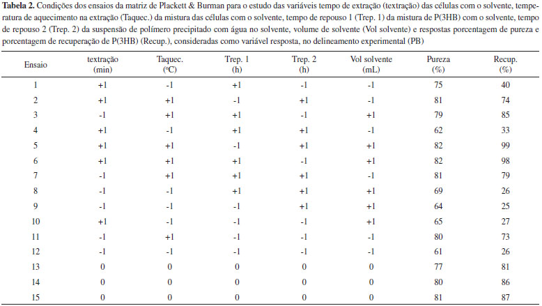 PARTE EXPERIMENTAL Biomassa A biomassa de Cupriavidus necator DSM 545 com P(3HB), utilizada neste estudo, foi produzida utilizando glicose/frutose como substrato. A estratégia utilizada no cultivo foi batelada alimentada, tendo como nutriente limitante o nitrogênio adicionado na forma de uréia. As fontes de nitrogênio e de carbono foram adicionadas de forma a se evitar a limitação destes nutrientes na fase de crescimento celular. O cultivo foi iniciado com 40 g L-1 de glicose/frutose (S) e 2 g L-1 de nitrogênio em um volume inicial de 3 L no biorreator. A fase de crescimento se caracterizou pela produção de cerca de 20 g L-1 de células. Na fase de produção, ocorreu limitação da fonte de nitrogênio e realizaram-se pulsos de glicose/frutose para manter a concentração desses substratos acima de 15 g L-1. Tratamento térmico da biomassa Após o término do cultivo de C. necator, elevou-se a temperatura da suspensão de biomassa para 95 ºC durante 45 min, para inativar a enzima PHA depolimerase, responsável pela degradação do biopolímero, e desnaturar as proteínas e, consequentemente, desestabilizar a parede celular e facilitar a ação do solvente na solubilização do P(3HB).13 Posteriormente, a biomassa foi centrifugada a 2000 g por 15 min e lavada com água destilada, sendo o sobrenadante descartado. O precipitado (células com P(3HB)) foi submetido à secagem a 65 ºC por 24 h. Extração de P(3HB) Para a extração do polímero, foi utilizado o método baseado nos estudos de Lafferty e Heinsle11 e Fiorese et al.,14 com modificações. A massa de células (11,5 g) foi suspensa em um volume de carbonato de propileno (Merck Schuchardt OHG'- pureza 99,7%) aquecido à determinada temperatura. Considerou-se como instante inicial de extração o momento em que se atingiu a temperatura desejada. Os experimentos foram realizados em rotaevaporador sob agitação constante de 120 rpm. A suspensão (carbonato de propileno, debris celulares e P(3HB)) obtida após diferentes tempos de extração foi submetida à filtração a quente sob vácuo em aparato composto por kitassato, funil de porcelana, filtro de papel qualitativo com poro de 14 µm e diâmetro de 12,5 cm (Qualy®) e bomba a vácuo (J. B. Industries - DV 200N 250). Os sólidos retidos no filtro foram lavados com 30 mL de carbonato de propileno aquecido na mesma temperatura da extração. A solução permeada composta de P(3HB) dissolvido em solvente permaneceu em repouso por um determinado período de tempo (indicado como Tempo1), à temperatura ambiente. Após o tempo de repouso, água destilada foi adicionada em uma relação 4:1 (água:solvente) à solução para a precipitação do polímero, a fim de obter uma suspensão de P(3HB) precipitado em uma mistura de água e carbonato de propileno. Esta suspensão permaneceu sob agitação constante por um dado intervalo de tempo (indicado como Tempo 2), em agitador magnético. Posteriormente, a suspensão foi submetida a uma segunda filtração (mesmo aparato utilizado na primeira filtração) à temperatura ambiente, em filtro qualitativo de 14 µm e diâmetro de 12,5 cm (Qualy®). O material polimérico retido no filtro foi lavado com 100 mL de água destilada, sendo posteriormente o filtro contendo a massa polimérica disposto em estufa a 65 ºC por 24 h para secagem. Seleção das variáveis que influenciam a extração de P(3HB) por carbonato de propileno Com o objetivo de definir as variáveis que influenciam no método de extração proposto, utilizou-se um delineamento experimental Plackett & Burman (PB)15 de 12 ensaios acrescidos de 3 pontos centrais. As variáveis de processo avaliadas neste trabalho foram: Tempo de repouso 1 e 2, temperatura de extração, volume de solvente da extração e tempo de extração. Os valores destas variáveis estudadas nas condições de nível inferior (-1), nível superior (1) e ponto central (0) podem ser visualizadas na Tabela 1. Nos ensaios do delineamento PB foram utilizadas células com 34,5% de P(3HB). As variáveis respostas analisadas foram porcentagem de pureza e porcentagem de recuperação do polímero.