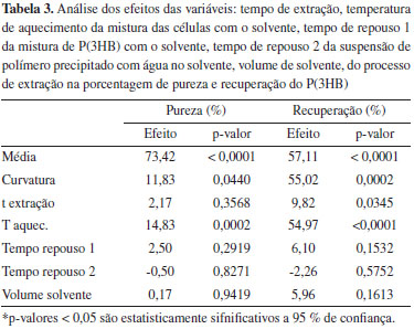 Observa-se que a pureza do P(3HB) variou de 60 a 82%, e a recuperação de 25 a 99%. Ainda de acordo com esses resultados, duas condições testadas para extração do P(3HB) se destacaram: os experimentos 5 e 6, nos quais foram utilizadas as combinações de 45 min de tempo de extração, 150 ºC de temperatura de aquecimento, tempos de repouso (1) e (2) entre 12 e 24 h e volume de solvente de 75 mL. Os experimentos 5 e 6 apresentaram 82% de pureza e recuperação de 99 e 98%, respectivamente. Os ensaios com temperatura de extração de 110 ºC apresentaram pureza entre 61 e 75% e recuperação em torno de 25 e 33%. Segundo Lafferty e Heinzle,11 valores de temperatura variando entre 100 e 120 ºC em curtos tempos de extração promovem recuperação incompleta de P(3HB), o que foi confirmado com os resultados obtidos neste estudo. A Tabela 3 apresenta os efeitos das variáveis sobre as respostas de pureza (%) e recuperação de P(3HB) (%) extraído utilizando carbonato de propileno como solvente, respectivamente.