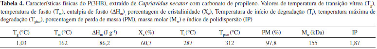 Segundo Xu et al.18 e Pachekoski et al.,19 bandas em torno de 2928 e 2988 cm-1 correspondem a deformações axiais simétrica e assimétrica da ligação C-H na cadeia de P(3HB). Na amostra analisada, estes valores foram de 2934 e 2976 cm-1. Bandas em 1724 cm-1 foram observadas e são atribuídas a deformações axiais da carbonila C=O e o alongamento simétrico e assimétrico do grupo C-O-C pode ser representado em bandas de absorção entre 1228-1278 cm-1.20,21 De acordo com Pachekoski et al.,19 a técnica FT-IR pode ser utilizada para determinar o grau de cristalização do P(3HB), por meio do monitoramento da deformação da carbonila C = O, região vibracional entre 1780 e 1700 cm-1. Liao et al.22 afirmam que as alterações espectrais durante a cristalização do P(3HB) representam a banda da carbonila em 1740-1720 cm-1, sendo que a fase amorfa está próxima a 1738 cm-1 enquanto que a banda da fase cristalina está em torno de 1722 cm-1. No presente estudo, um pico em 1724 cm-1 foi observado, evidenciando a cristalinidade do P(3HB) extraído com a metodologia proposta. O pico de deformação angular simétrica dos grupos CH3 em 1381 cm-1 foi observado e está de acordo com os picos descritos por Vogelsanger et al.23 e Garcia24 para o P(3HB). Uma banda em 3439 cm-1 também foi obsevada, e pode ser devido à presença de umidade na amostra. Camargo et al.,25 analisando biopolímero da PHB industrial (Serrana, SP), observaram um pico em 3443 cm-1, o qual foi atribuído ao estiramento OH, indicando presença de umidade no material. Com a análise de FT-IR foi possível confirmar o polímero extraído como sendo o P(3HB) e concluir que o processo de extração deste a partir de cultivo de C. necator, com carbonato de propileno, não causou alterações químicas drásticas em sua cadeia polimérica, pois os picos de absorção obtidos estão de acordo com os reportados na literatura para o espectro de P(3HB) puro. Na Tabela 4 estão apresentados os dados de caracterização, obtidos a partir das análises de calorimetria diferencial de varredura (DSC), termogravimétrica (TGA) e cromatografia de pemeação em gel (GPC) para o P(3HB) extraído com carbonato de propileno.