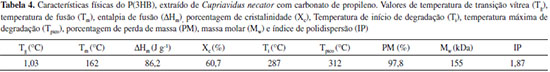 | Extração de poli(3-hidroxibutirato), produzido por Cupriavidus necator, com carbonato de propileno Extraction of poly(3-hydroxybutyrate), produced by Cupriavidus necator, with propylene carbonate |
