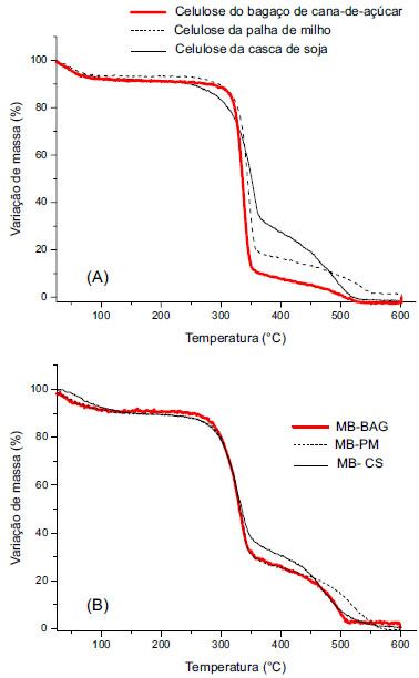 ![]() Figura 1. TGA da celulose do bagaço de cana-de-açúcar, palha de milho e casca de soja (A) e TGA das membranas de celulose regenerada, MB-BAG, MB-PM e MB-CS (B)