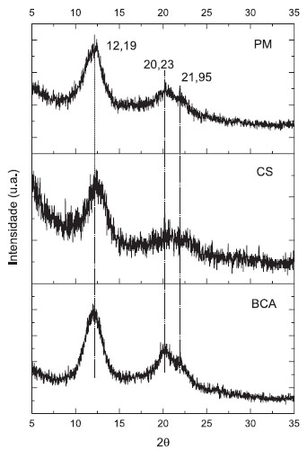 ![]() Figura 2. Difratogramas de Raios-X das membranas de celulose regenerada obtidas a partir da celulose extraída da Palha de Milho (PM), da Casca de Soja (CS) e do Bagaço de cana-de-açúcar (BCA)