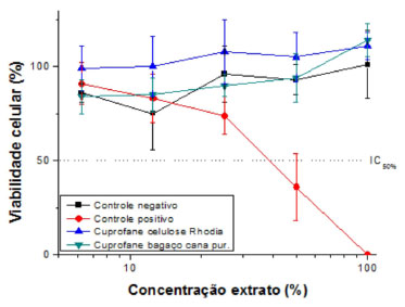 Os valores obtidos mostram que a porcentagem de íons Cu (II) retido nas membranas independe da fonte de celulose empregada. No entanto, a retenção destes íons depende do processo de deslignificação do material e do processamento das membranas. Em trabalhos anteriores, a alteração do processo de deslignificação dos resíduos agroindustriais, no qual se dobrou o tempo de refluxo com solução ácido nítrico/etanol, a fim de reduzir o teor de lignina e hemicelulose, levou a uma redução do teor de íons cobre (II) de 0,4468%7 para 0,3634%.8 No presente trabalho, o processo de deslignificação também foi modificado. São realizados três refluxos sucessivos com solução de ácido nítrico/etanol e, posteriormente, um tratamento com solução de NaOH 1 mol L-1. Essa alteração no procedimento reduziu ainda mais o teor de lignina residual em aproximadamente dez vezes. Quanto ao processamento das membranas, também ocorreram alterações. Removeu-se a etapa em meio alcalino, observada em trabalhos anteriores7,8 e aumentou-se o tempo no banho ácido, que contribui para a remoção dos íons cobre (II) da estrutura das membranas com maior eficiência. As modificações do método de deslignificação e do processamento das membranas levaram a uma diminuição acentuada no teor de íons cobre II em cerca de 15 vezes. Esses resultados mostram que a presença de lignina contribui para a retenção de íons cobre (II), o que ocorre devido ao complexo formado entre a macromolécula e o íon. Destaca-se que as membranas atuais apresentam valores de teor de íons cobre (II) apenas 2 vezes superior ao valor encontrado na literatura para membranas comerciais.9 Ensaios de citotoxicidade Nos ensaios de citotoxicidade as membranas foram colocadas diretamente em contato com uma cultura de células de mamíferos. Foram observadas alterações celulares por meio de diversos mecanismos, sendo que um deles consiste na incorporação de corantes vitais, como o realizado neste trabalho. O corante é solúvel em água e atravessa a membrana celular concentrando-se nos lisossomos. Danos causados à membrana celular devido à presença de substâncias tóxicas resultam na diminuição da adsorção do corante pela célula. Neste caso, células vivas podem ser distinguidas de células mortas pela intensidade da cor do meio de cultura.26,27 O resultado do ensaio de viabilidade celular em função da concentração do extrato produzido é observado na Figura 3.