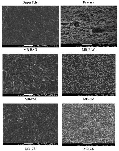 A partir da Figura 3, observa-se que a viabilidade celular não sofre diminuição significativa com o aumento da concentração da amostra. Isso mostra que tanto o material padrão (MB-ROD) como a membrana produzida a partir da celulose do bagaço de cana-de-açúcar (MB-BAG) não apresentam reações adversas às culturas celulares, o que indica que as membranas produzidas a partir da celulose do bagaço de cana-de-açúcar não apresentam comportamento citotóxico. O teste foi realizado apenas para as membranas de celulose do bagaço de cana-de-açúcar porque as demais seguem o mesmo perfil, devido à semelhante composição química e a serem submetidas ao mesmo processo de deslignificação. Microscopia eletrônica de varredura A morfologia das membranas exerce papel relevante na sua aplicabilidade, o que torna necessária a sua investigação. As microscopias da superfície e fratura das membranas produzidas são observadas na Figura 4.