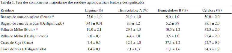 RESULTADOS E DISCUSSÃO Teor de polissacarídeos e lignina Os valores dos teores de polissacarídeos e lignina dos resíduos agroindustriais brutos e deslignificados estão apresentados na Tabela 1.