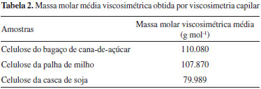 Ao observar os dados na Tabela 1, verifica-se que a soma dos teores dos polissacarídeos e lignina são diferentes de 100% (m/m). Essa discrepância é justificada pelo fato dos experimentos de quantificação serem realizados separadamente e a partir de amostras diferentes. Ainda algumas das fontes lignocelulósicas avaliadas como, por exemplo, a palha de milho, têm elevada porcentagem de extrativos, cerca de 28,0% e, devido a este aspecto, a porcentagem é menor que 100%, o mesmo aspecto deve ser válido para a casca de soja. Além disso, os valores dos desvios-padrões devem ser considerados. Para todos os resíduos agroindustriais foi observada uma redução do teor de lignina com o tratamento das amostras. Entretanto, o teor de lignina remanescente nos materiais deslignificados é diferente para cada fonte lignocelulósica empregada. Uma possível explicação para as diferenças encontradas está relacionada à estrutura química da lignina que difere de acordo com a matéria-prima empregada. A estrutura química da lignina apresenta diferentes proporções de unidades monoméricas: guaiacila, G; siringila, S e p-hidroxifenila, H dependendo do tipo de fonte lignocelulósica, por exemplo, a lignina da madeira de eucalipto tem sua estrutura geralmente formada pelas unidades siringila e guaiacila (lignina S-G). A lignina de gramíneas, em geral, possui em sua composição três tipos de unidades monoméricas: p-hidroxifenila, guaiacila e siringila (lignina H-G-S). A estrutura química da lignina é um parâmetro importante na indústria de polpa celulósica, uma vez que a reatividade dos monômeros influencia o desempenho do processo de deslignificação, sendo a unidade siringila a mais reativa entre os monômeros. Parâmetros do processo de deslignificação, como a cinética de reação, o consumo dos reagentes, o rendimento da polpa produzida, estão relacionados ao tipo de lignina que será removida.16,17 A remoção da hemicelulose das amostras foi menos eficiente que a remoção da lignina. O teor de hemicelulose na polpa celulósica depende do quão eficiente é o processo de deslignificação em extraí-las e reprecipitá-las.18 Em virtude da estrutura complexa das fibras vegetais e da integração das estruturas poliméricas em nível de macromoléculas individuais, existem muitas dificuldades na separação dos constituintes minoritários em frações discretas. Durante o processo de polpação, a hemicelulose, dependendo do processo empregado, é completa ou parcialmente degradada junto com a matriz de lignina. Esta é a razão primordial que limita a exploração das características químicas e estruturais da hemicelulose em trabalhos científicos e tecnológicos.19 Na indústria do papel, a presença da hemicelulose é importante para aumentar a coesão entre as fibras que funcionam como um elemento de ligação. Além disso, devido a sua elevada hidrofilicidade, as hemiceluloses atuam como plastificante, tornando mais flexível as fibras e mais processável o papel.18 Nas membranas, a presença das hemiceluloses pode ter efeitos vantajosos, como plastificante,20 flexibilizando e melhorando a trabalhabilidade da membrana sem provocar efeitos adversos do ponto de vista da biocompatibilidade e citotoxicidade, uma vez que, devido a sua natureza biológica, estas macromoléculas vêm sendo utilizadas na confecção de biomateriais como o Veloderm®, que é uma película biológica natural para cicatrização de feridas.21 Em relação ao teor de celulose, após a deslignificação, a palha de milho é a fonte lignocelulósica que possui a maior porcentagem em relação às demais fontes. Massa molar média viscosimétrica A seleção de polpas celulósicas para a produção de celulose regenerada é baseada em alguns parâmetros, como o tipo de polpa empregada e a massa molar média viscosimétrica, uma vez que estes parâmetros influenciam propriedades como a solubilidade das polpas celulósicas e a habilidade de formar filmes com boas propriedades mecânicas e boa estabilidade durante o manuseio.22 Diante da necessidade de avaliar a potencialidade do uso destas fontes lignocelulósicas na produção de membranas celulose regenerada, um dos parâmetros avaliados é a massa molar média viscosimétrica cujos resultados estão apresentados na Tabela 2.