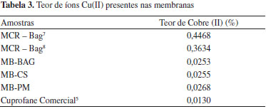 Os picos de difração para a celulose nativa (celulose I) aparecem em 2θ = 14.67º, 16.39º e 22.53 para os planos (110), ( As membranas preparadas neste trabalho apresentam os valores de 2θ em 12,19º, 20,23º e 21,95º para os planos (110), (110) e (200), sendo compatível com o esperado para a celulose regenerada. Espectroscopia de absorção atômica As membranas produzidas a partir da regeneração da celulose dissolvida em CUEN (hidróxido de bis (etilenodiamino) cobre (II)), podem reter íons cobre (II) em sua estrutura, mesmo após o processo de regeneração da membrana em meio ácido. Dependendo do tipo de aplicação das membranas estudadas o elevado teor de íons cobre será indesejado e deverá ser monitorado, como no caso de membranas para uso na terapia de hemodiálise. Considerando este aspecto, as membranas foram avaliadas quanto ao teor de íons cobre. Os resultados estão resumidos na Tabela 3.