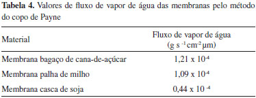 As micrografias da superfície das membranas apresentam morfologia dependente do tipo de fonte lignocelulósica, embora tenham sido processadas da mesma forma. No corte transversal, observam-se algumas diferenças estruturais. Nas membranas produzidas a partir da celulose do bagaço de cana-de-açúcar e da palha de milho são observados poros dispersos de forma não uniforme. Este aspecto não é observado na membrana produzida a partir da casca de soja, que apresenta uma estrutura mais densa. A preparação das membranas foi realizada a partir da dissolução da celulose em Hidróxido de bis (etilienodiamino) cobre (II) e, depois de espalhadas em placa de vidro, o solvente evaporou livremente. Apesar da evaporação livre do solvente, as membranas apresentam um aspecto poroso, devido à baixa taxa de evaporação do mesmo. O maior tempo de permanência do solvente facilita a formação de poros. Entretanto, a membrana da casca de soja apresenta estrutura menos porosa, que pode ser explicada devido à presença de hemicelulose reprecipitada durante a regeneração da membrana, visto que esta fonte lignocelulósica apresenta o maior teor de hemicelulose. A hemicelulose apresenta uma estrutura complexa19 e, como citado anteriormente, contribui para a coesão entre as fibras e atua como plastificante.17 Devido a esse comportamento, provavelmente a hemicelulose B colabora para o maior empacotamento, aumentando a coesão entre as cadeias celulósicas e diminuindo a ocorrência de formação de poros. Medidas de transporte Fluxo de vapor de água pela técnica do copo de Payne A morfologia das membranas é um fator importante nas propriedades de transporte. Um dos testes utilizados para verificar essa influência é o fluxo de vapor de água, o qual avalia a passagem de vapor de água através das membranas. O fluxo é um indicativo da presença de canais ou poros por onde a água é transferida para a superfície da membrana por evaporação.28 A Tabela 4 apresenta o fluxo de vapor de água para as membranas produzidas a partir da celulose do bagaço de cana-de-açúcar, da palha de milho e da casca de soja.