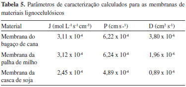 Os valores obtidos, apresentados na Tabela 4, mostram que as membranas do bagaço da cana-de-açúcar e da palha de milho apresentam os maiores valores de fluxo de vapor de água e a membrana da casca de soja, o menor. Este resultado pode estar relacionado à morfologia da membrana e sua relação com as diferenças entre as fontes utilizadas. Como visto na Figura 3, as membranas produzidas a partir do bagaço de cana-de-açúcar e da palha de milho possuem uma estrutura porosa, e a presença desses poros favorece a passagem do vapor de água pela membrana. Já a membrana produzida a partir da casca de soja apresenta uma estrutura com maior empacotamento das cadeias poliméricas e sem poros, o que justifica o menor valor de fluxo apresentado. Além disso, o maior teor de hemicelulose B pode dificultar a passagem do fluxo de água, visto que na literatura há trabalhos que relatam o uso de um material derivado da hemicelulose com potencialidade para a produção de filmes com capacidade de barreira em relação ao oxigênio.29 Difusão de íons através das membranas Todas as membranas foram avaliadas quanto ao seu desempenho em experimentos de difusão de íons por diálise. A concentração de eletrólito que atravessa a membrana foi obtida por uma curva de calibração da solução de KCl. A partir da inclinação de uma curva de concentração versus tempo e o volume dos compartimentos, pode-se calcular o fluxo através da membrana (J) e, então, o coeficiente de permeabilidade (P).30 A Tabela 5 mostra os valores do fluxo, coeficiente de permeabilidade e coeficiente de difusão calculados para as membranas de celulose regenerada.