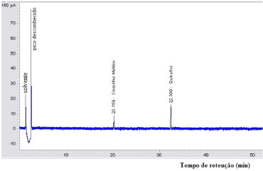 ![]() Figura 1. Representação gráfica do cromatograma, obtido por CG-DFC, de amostra de leite fluído UHT produzido no Estado de Minas Gerais