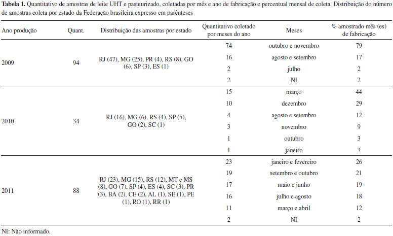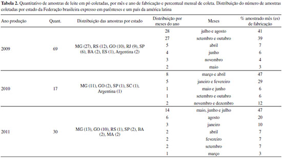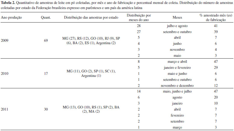 Leite em pó integral Foram analisadas 107 amostras de leite em pó integral e duas de leite desnatado, acondicionadas em embalagens flexíveis de poliéster metalizado/polietileno ou lata metálica. As amostras coletadas foram fabricadas em diferentes áreas de produção brasileira e duas na Argentina. O maior número de amostras de leite em pó coletado foi produzido no estado de MG (47), correspondendo a cerca de 47% das amostras coletadas. As amostras foram fabricadas no período de 11/04/2009 a 23/09/2011. A Tabela 2 especifica o quantitativo de amostras de leite em pó coletadas, por mês, ano de fabricação e percentual mensal de coleta e o número de amostras coletadas por estado da Federação Brasileira, expresso em parênteses.