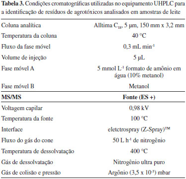 Extração das amostras As amostras de leite fluído foram pesadas (m = 15 g) e extraidas por método QuEChERS conforme procedimento anteriormente descrito.21 A amostra foi homogeneizada por cinco minutos em liquidificador de copo de vidro, pesada e colocada em frasco de 50 mL para uso em centrífuga. Em seguida, foi adicionado 1 mL do QA1 (clorpirifós-metil) e homogeneizado. Após 25 min, foi iniciada a extração com a adição de 15 mL de acetonitrila (1% ácido acético) e agitação em vortex. Foram realizadas duas etapas de limpeza da amostra com extração em fase sólida dispersiva (SPE-D): na primeira, foi adicionado MgSO4 + 1,5 g Na(C2H3O2) e na segunda foi feita a limpeza da amostra utilizando a combinação de sorbentes (50 mg PSA + 50 mg alumina + 150 mg MgSO4). As amostras de leite em pó foram diluídas em água deionizada, conforme recomendações de consumo na rotulagem e analisadas com o mesmo procedimento utilizado para o leite fluído. Condições cromatográficas Equipamento: cromatógrafo a gás HP 7890 (Agilent), equipado com detector por fotometria em chama (CG-DFC) em modo fósforo (P); sistema de injeção automático e estação de trabalho - ChemStation. Temperatura do injetor e detector de 230 ºC e 250 ºC, respectivamente. Coluna 50% fenil-metil siloxano (DB-17MS) com 30 m de comprimento; 0,25 mm de diâmetro interno e 0,25 µm de espessura de filme. Programação de temperatura do forno de 100 ºC (0 min), 25 ºC min-1 a 170 ºC (1 min), 1 ºC min-1 a 180 ºC (1 min), 1 ºC min-1 até 230 ºC (0 min), 5 ºC min-1 até 260 ºC (5 min), 20 ºC min-1 até 280 ºC (10 min). Fluxo de gás carreador (Hélio) = 1,5 mL min-1, fluxo da purga do septo = 3,0 mL min-1, fluxo total = 61,5 mL min-1, fluxo do gás auxiliar (Nitrogênio) = 60 mL min-1, modo de injeção sem divisão de fluxo = 1,0 min, volume injetado = 1,0 µL. O tempo total de corrida foi de 80 min e a integração feita pelo parâmetro da área dos picos. Confirmação dos agrotóxicos identificados no leite fluído e em pó Parte dos analitos identificados foram confirmados utilizando um cromatógrafo líquido de ultra-alta eficiência modelo ACQUITY UPLCTM acoplado ao espectrômetro de massas tipo triplo quadrupolo por eletronebulização (UHPLC-ESI-MS/MS) modelo Quatro Premier XE operando em modo MRM com ionização por eletrospray no modo íon positivo e estação de trabalho MassLynxTM. Os resíduos dos analitos acefato, clorpirifós, fentiona, fosmete, metamidofós, pirazofós e terbufós foram confirmados em amostras de leite UHT e em pó por cromatografia líquida de alta eficiência acoplada à espectrometria de massas sequencial (LC-MS/MS) com procedimento previamente descrito em trabalho anterior.7 Os OPS foram confirmados utilizando o íon precursor e dois íons de transição, os íons avaliados, expressos entre parenteses respectivamente foram: acefato (m/z 184; 143 e 95), clorpirifós (m/z 349; 197 e 96), fentiona (m/z 279; 168 e 104), fosmete (m/z 318; 160 e 133), metamidofós (m/z 142; 125 e 94), pirazofós (m/z 374; 222 e 194) e terbufós (m/z 289; 103 e 70). Entretanto, os organofosforados identificados no ano de 2009 não puderam ser confirmados, pois no período de implementação do método de avaliação, pelo LC-MS/MS, as amostras já haviam deteriorado. As condições cromatográficas utilizadas no equipamento ACQUITY UPLCTM para a identificação das amostras encontram-se descritas na Tabela 3.