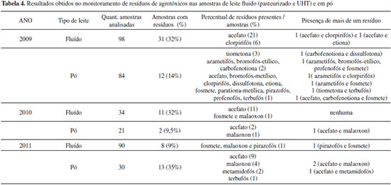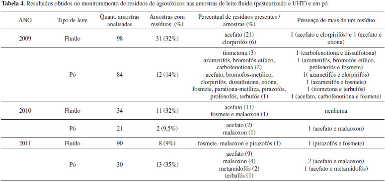 Leite em pó Nos três anos de monitoramento, foram analisadas 109 amostras de leite em pó. Constatou-se que 30 amostras (27%) apresentaram o mesmo pico não identificado tR (min) = 2 ± 0,5 que ocorreu nos cromatogramas do leite fluído. Agrotóxicos identificados nas amostras analisadas Tanto nas amostras de leite fluído quanto nas de leite em pó foram encontrados resíduos de acefato, clorpirifós, etiona, fentiona, fosmete, malaoxon, pirazofós. Vários outros foram encontrados somente nas amostras de leite em pó: bromofós-metílico e etíllico, carbofenotiona, dissulfotom, azametifós, parationa-metílica, pirazofós, profenofós, terbufós e tiometona. A Tabela 4 ilustra as amostras de leite fluído em pó analisadas: quantidade, identidade, presença e percentual de resíduos.