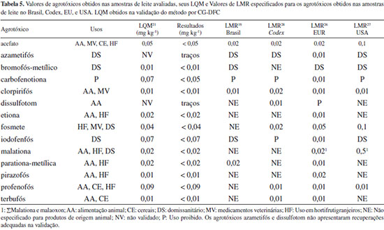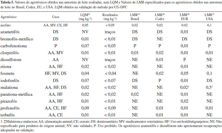 | Monitoramento de resíduos de agrotóxicos da classe dos organofosforados por CG-DFC em amostras de leite fluído e em pó Monitoring of organophosphorus pesticide residues in fluid and powdered milk by gas chromatography with flame photometric detector |
