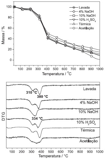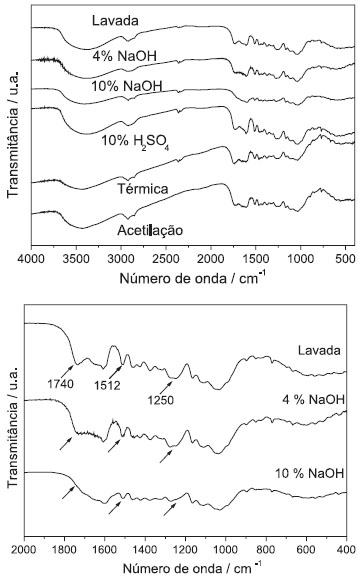 Ao comparar as curvas termogravimétricas (TG/DTG) da fibra de piaçava lavada com as tratadas com 4 e 10% de NaOH observa-se o mesmo início da degradação próximo a 220 ºC e perda de massa aproximadamente de 80% e 90%, respectivamente, conforme a Figura 1. Nas curvas de DTG observaram-se a diminuição da intensidade do pico referente à hemicelulose com máximo em cerca de 300 ºC na amostra tratada com 4% de NaOH e o desaparecimento deste mesmo pico nesta região na amostra tratada com 10% de NaOH, com aparecimento de um único pico mais largo com máximo em 334 ºC. Ao aumentar a concentração da solução alcalina observa-se mais nitidamente a remoção parcial da hemicelulose e lignina. Nas fibras tratadas com temperatura e ácido sulfúrico não se observou alteração quando comparado com a curva termogravimétrica da fibra lavada com água. A fibra acetilada apresentou uma sobreposição dos eventos relacionada à degradação da hemicelulose e celulose devido à presença de novos grupos, que possivelmente degradam nesta temperatura. A espectroscopia na região do infravermelho foi empregada para analisar as estruturas químicas das amostras. Os espectros na região do infravermelho da fibra lavada e tratada são mostrados na Figura 2. Pode-se observar a presença dos grupos funcionais dos três componentes da fibra que são constituídos por alceno, ésteres, aromáticos, cetonas e álcool, com diferentes grupos funcionais contendo oxigênio, por exemplo: O-H (3400 - 3200 cm-1), C=O (1765 -1715 cm-1), C-O-C (1270 cm-1), e C-O-H (1050 cm-1).31 Ao comparar os espectros das fibras mercerizadas e o espectro da fibra sem tratamento observou-se que houve um desaparecimento das bandas em 1740 e 1250 cm-1 com o aumento da concentração da solução alcalina, atribuídas principalmente a modos de vibração de grupamentos C=O e C-O-C presentes na lignina e na hemicelulose, que foram parcialmente removidos durante a mercerização. Em 1512 cm-1 foi observado um pico associado à vibração do C-H do anel aromático, presente principalmente na lignina. Houve uma diminuição da intensidade do evento com o aumento da concentração da solução alcalina.35 Ao comparar o espectro da fibra sem tratamento com a tratada termicamente e com ácido sulfúrico revela que não houve nenhuma alteração nas bandas referentes aos grupos funcionais presentes na hemicelulose, celulose e lignina. Ao analisar o espectro da fibra acetilada foi observado o aparecimento das bandas nas regiões de 1750 cm-1 e 1240 cm-1 (que estavam menos acentuadas devido à lavagem superficial com a solução de 4% NaOH antes da acetilação) no espectro atribuído aos estiramentos dos grupamentos C=O e C-O-C respectivamente, originado pela inserção do acetato nas fibras por meio da reação de acetilação, com a finalidade de indicar que a superfície da fibra foi quimicamente modificada, ilustrado na Figura 2.
