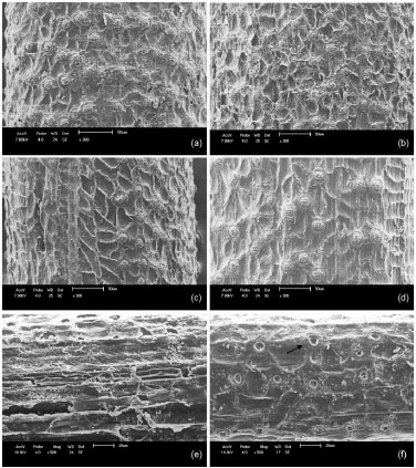 ![]() Figura 3. Micrografias eletrônicas de varredura da superfície do bagaço da fibra de piaçava lavada (a), tratada com 10% H2SO4 (b), 4% NaOH (c), 10% NaOH (d), térmica (e) e acetilada (f). Imagens obtidas em ampliaçao 300x de a-d e 500x de e-f