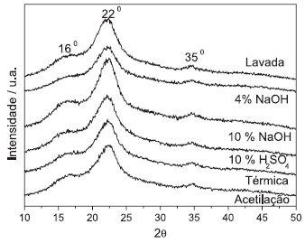 ![]() Figura 4. Difratogramas de raios X das fibras de piaçava lavada e tratadas