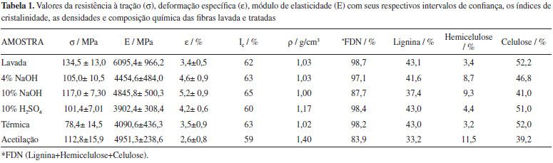 Os tratamentos físicos, por exemplo o tratamento térmico, atuam na superfície das fibras, resultando na desfibrilação da superfície. Os tratamentos químicos atuam não só na superfície das fibras, mas podem alcançar camadas mais internas das mesmas. O tratamento de fibras com solução alcalina é muito utilizado como pré-tratamento ou revestimento das fibras naturais, pois neste sistema ocorre a quebra das ligações de hidrogênio que unem as cadeias de celulose, conferindo uma superfície mais rugosa que, em compósitos de matrizes poliméricas, pode auxiliar na ancoragem mecânica. A remoção de alguns constituintes (lignina e hemicelulose) aumenta o grau de cristalinidade destas fibras e facilita a separação das microfibrilas de celulose presentes.14 A baixa densidade da fibra é de grande interesse industrial devido à possibilidade de produzir materiais resistentes e leves. Como mostrado na Tabela 1, o rejeito da fibra de piaçava possui uma baixa densidade e, ao decorrer dos tratamentos, a mesma variou, diminuindo muito pouco com os tratamentos alcalinos e com ácido sulfúrico. A densidade das fibras aumentou com o tratamento de acetilação devido ao acréscimo de novas estruturas na superfície da fibra.