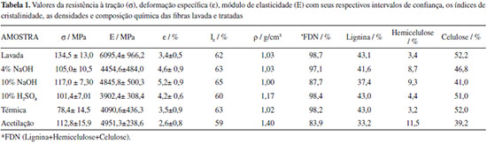 IDepartamento de Físico-Química, Instituto de Química, Universidade Federal da Bahia, 40170-115 Salvador - BA, Brasil Recebido em 13/02/2014 *e-mail: nadia@ufba.br The aim of this study was to investigate the effect of surface treatment on the properties of waste piassava fiber with the goal of aggregating additional business value. The fiber surface was subjected to four different treatments. In the present work, it was found that washing the fibers with water partially removed impurities from the surface rendering it rougher. Alkaline treatment removed impurities from the surface, hemicellulose and lignin, improving the flexibility of the fibers. Increasing the concentration of washing agents, times and temperature of treatment promoted intense defibrillation on the fiber surface, reducing its strength. INTRODUÇÃO Os últimos anos foram marcados pelo rápido desenvolvimento na área de compósitos reforçados por fibras naturais.1-3 Este desenvolvimento tem ocorrido porque as fibras vegetais oferecem várias vantagens em relação às fibras sintéticas: baixa densidade, alta deformabilidade, baixa abrasividade aos moldes e aos equipamentos de mistura, podem ser facilmente modificadas por agentes químicos, são biodegradáveis e apresentam baixo custo. Além de todas as vantagens discutidas na literatura, é sempre relevante ressaltar que estes materiais são provenientes de fontes renováveis ilimitadas.4-6 As fibras naturais podem ser consideradas como compósitos de fibrilas de celulose mantidas coesas por uma matriz constituída de lignina e hemicelulose, cuja função é agir como barreira natural à degradação microbiana e servir como proteção mecânica. Suas características estruturais estão relacionadas à natureza da celulose e à sua cristalinidade.7 A escolha da fibra na fabricação de compósitos poliméricos depende da sua disponibilidade na região. O Brasil se destaca na produção de algumas fibras naturais para possíveis aplicações em compósitos poliméricos tais como: sisal,8-11 bagaço de cana-de-açúcar,12-15 banana,16 curauá,17-18 coco,19-20 juta,21 piaçava,22,23 entre outras. A palmeira Attalea funifera Martius, conhecida por piaçava ou piaçaba, é espécie nativa e endêmica do sul do Estado da Bahia. A importância econômica da piaçaveira está na extração das suas fibras industriais, destacando-se a fabricação de vassouras, enchimento nos assentos de carros, cordoaria e escovões. O rejeito obtido de sua limpeza, que é conhecido como bagaço, fita ou borra, serve para cobertura de casas e quiosques nos meios rurais e urbanos.23 Esse material é classificado com a denominação de "refugo" no Decreto Federal 42.430, de 14-10-1957, por não apresentar as mesmas características da fibra. Ao realizar investigação sobre as propriedades das fibras de piaçava observou-se na composição química um alto teor de lignina, comparável ao teor encontrado na fibra de coco. A análise cristalográfica revelou que a celulose I é o principal constituinte cristalino, conferindo à fibra boas propriedades térmicas e mecânicas. Essas características fazem da fibra de piaçava um material promissor para a utilização como reforço em compósitos poliméricos.24-28 As propriedades mecânicas, assim como a composição das fibras naturais, apresentam variações consideráveis em seus valores. Estes fatores contribuem para que, em aplicações técnicas, seja necessária a modificação destas fibras com fins específicos. Estas modificações visam homogeneizar suas propriedades, diminuir a absorção de umidade e promover a adesão da fibra com a matriz.5,23 O objetivo deste trabalho foi modificar e caracterizar termicamente, estruturalmente, morfologicamente e mecanicamente a superfície do bagaço da fibra de piaçava com tratamentos alcalino, ácido, térmico e agente de acoplamento com a finalidade de agregar novo valor comercial ao rejeito industrial gerado na fabricação de vassouras (o bagaço) para aplicação como reforços em matrizes poliméricas.