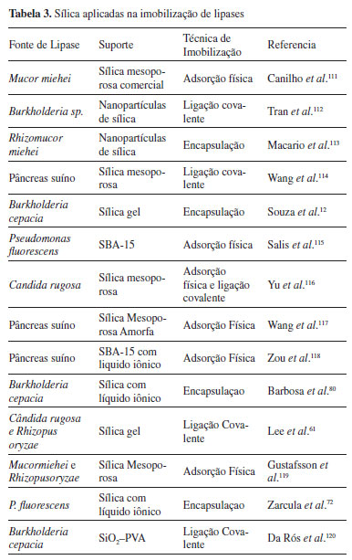 Porém, apesar da facilidade de obtenção da sílica (produzida ou comercial) e grande aplicação na imobilização de enzima, conforme Tabela 3, o aperfeiçoamento morfológico de suportes de sílica comercial ou produzida para a imobilização de biocatalisadores requer intenso estudo para que novas técnicas possam contribuir para a melhoria da estabilidade enzima aplicada aos processos biotecnológicos, como a aplicação de aditivos para modificação superficial do suporte.