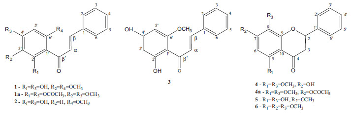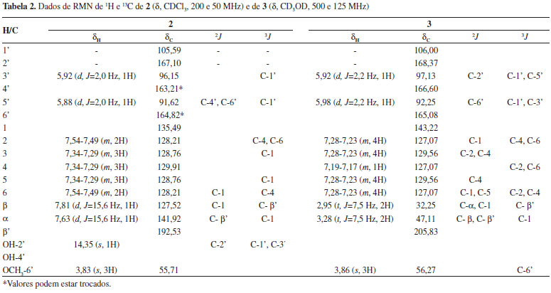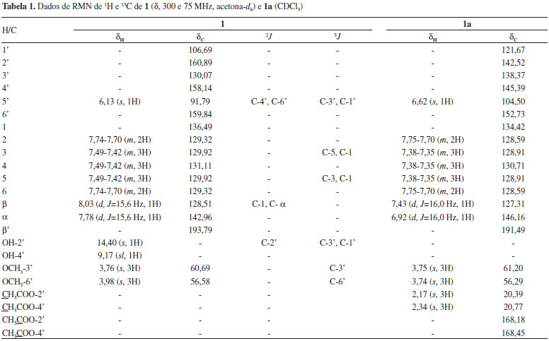 2',4'-diacetoxi-3',6'-dimetoxichalcona (1a), RMN de 1H e 13C (200 e 50 MHz, CDCl3), (Tabela 1). 2',4'-di-hidroxi-6'-metoxichalcona (2) cristais vermelhos, P.F.=163-165 ºC (lit. 193-196 ºC), RMN de 1H e 13C (200 e 50 MHz, CDCl3), (Tabela 2).