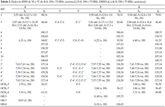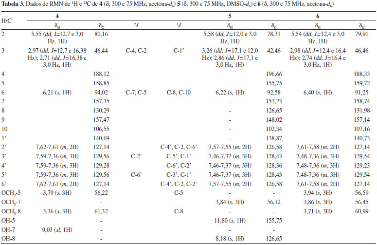 2',4'-di-hidroxi-6'-metoxidi-hidrochalcona (3) cristais amarelos, P.F.=174-176 ºC (lit. 185-187 ºC), RMN de 1H e 13C (500 e 125 MHz, CD3OD), (Tabela 2). 7-hidroxi-5,8-dimetoxiflavanona (4) cristais amarelos, P.F. = 158,5-160,5 ºC (lit.190-192 ºC), RMN de 1H e 13C (300 e 75 MHz, acetona-d6), (Tabela 3).