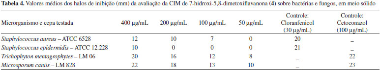 7-acetoxi-5,8-dimetoxiflavanova (4a), RMN de 1H e 13C (200 e 50 MHz, CDCl3). 5,8-di-hidroxi-7-metoxiflavanona (5) cristais amarelos, P.F. = 216-218 ºC (lit. 220-225 ºC), RMN de 1H e 13C (300 e 75 MHz, DMSO-d6), (Tabela 3). 5,7,8-trimetoxiflavanona (6) cristais amarelos, P.F. = 160-162 ºC (154-156 ºC), RMN de 1H e 13C (300 e 75 MHz, CDCl3), (Tabela 3). Avaliação da atividade antimicrobiana O método usado foi a técnica de difusão em meio sólido.15 Em placas estéreis foi depositado 1 mL de cada cepa de microrganismo em suspensão em soro fisiológico, padronizada pelo tubo 0,5 da escala de McFarland e ajustada para 90% T (530 nm), correspondendo aproximadamente a 106 UFC. Em seguida, adicionou-se 21 mL do meio sólido fundido a 50 ºC. Quando solidificado, foram feitas no meio de cultura cavidades de 6 X 8 mm de diâmetro. Após essa etapa, foram depositados 50 µL do composto 4 solubilizado em DMSO em diferentes concentrações. Os controles foram realizados com cloranfenicol para bactérias e cetoconazol para fungos. Os ensaios foram incubados a 24-48 h para bactérias e leveduras a temperatura ambiente (28-30 ºC) e durante 10-14 dias para fungos filamentosos.16 A atividade biológica do produto foi considerada positiva quando o halo de inibição de crescimento foi igual ou superior a 8 mm de diâmentro.17 Para os ensaios de avaliação da atividade antimicrobiana foram utilizados os seguintes microrganismos: Staphylococcus aureus - ATCC 6528, Staphylococcus epidermidis - ATCC 12.228, Pseudomonas aeruginosa - LM B6, Escherichia coli - B 04, Candida albicans - LM 32, Candida tropicalis - LM 25, Candida knisei - LM 07, Candida guilliermondii - LM 16, Trichophyton rubrum - LM 75, Trichophyton mentagrophytes - LM 06, Microsporum caniis - LM 828, Aspergillus flavus - LM 27, Penicillium - LM 131 e Fusarium - LM 135.