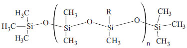 ![]() Figura 1. Estrutura química do polímero poli(dimetil-co-alquilmetilsiloxano). R refere-se aos grupos C18H37 ou C16H33 e n refere-se ao número de unidades monoméricas