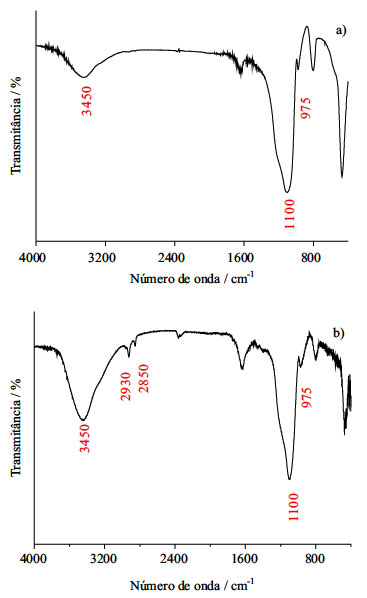 ![]() Figura 2. Espectros de infravermelho do a) suporte de sílica e b) do sorvente Si(PDAS)