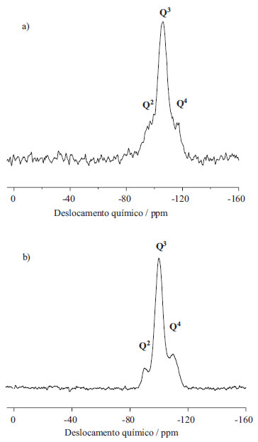 ![]() Figura 3. Espectros de RMN de 29Si do a) suporte de sílica e do b) sorvente Si(PDAS)