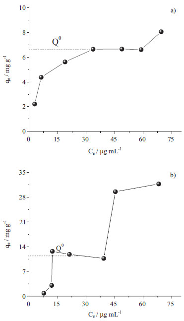 ![]() Figura 4. Isotermas de sorção a 28 ºC do propranolol a) no sorvente Si(PDAS) e b) no sorvente SiC18 quimicamente ligada