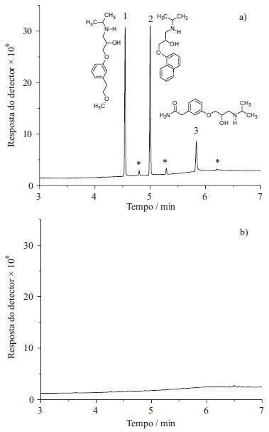 ![]() Figura 5. Cromatograma dos extratos de amostras de água obtidos na a) primeira eluição e na b) segunda eluição empregando o mesmo sorvente Si(PDAS). Identificação dos picos: 1- metoprolol, 2- propranolol, 3- atenolol e *- impurezas