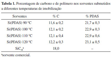 A ausência da ligação química entre o PDAS e a sílica não implica em um sorvente de qualidade inferior aos sorventes quimicamente ligados. Devido à inércia química do PDAS, evitando a sua solubilização nos eluentes orgânicos e aquosos, e ao seu recobrimento mais eficiente da superfície do suporte, o contato de substâncias adsorventes à sílica pode ser minimizado, promovendo majoritariamente interações hidrofóbicas entre o sorvente e os analitos. O teor de carbono da fase sólida Si(PDAS) foi determinado por análise elementar, sendo possível, dessa forma, inferir sobre a quantidade de polímero imobilizado sobre a superfície do suporte. Foi realizado também um estudo para verificar o efeito da temperatura de imobilização do polímero PDAS na sílica sob temperaturas de 90, 100, 110 e 120 ºC por 12 h. Os resultados obtidos dessas medidas estão apresentados na Tabela 1. A massa de PDAS imobilizada na sílica foi determinada pela expressão % PDAS = [%C/(65 - %C)] × 100, em que 65 refere-se a quantidade percentual de carbono por unidade monomérica do polímero.39