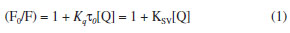 ![]() Figura 4. Gráficos de Stern-Volmer referentes ao modelo estático da interação de HSA com complexo de rutênio, em solução tampão Tris-HCl pH = 7,4, λexc. = 280 nm