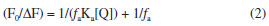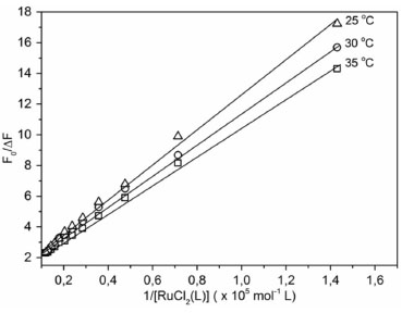 Analisando a Figura 3A, para o sistema BSA-[RuCl2(L)], observamos que o aumento da temperatura resultou em aumento dos valores de Ksv,{5,72 x 104 mol-1 L (25 ºC), 6,84 x 104 mol-1 L (30 ºC) e 8,16 x 104 mol-1 L (35 ºC)} indicando que o processo de supressão ocorreu predominantemente via mecanismo dinâmico. Para o sistema HSA-[RuCl2(L)], Figura 3B, verificamos que o aumento da temperatura resultou na diminuição dos valores de Ksv,{9,17 x 103 mol-1 L (25 ºC), 8,65 x 103 mol-1 L (30 ºC) e 8,06 x 103 mol-1 L (35 ºC)} indicando que a inserção do complexo de rutênio no arcabouço proteico ocorreu predominantemente pelo mecanismo estático. Diante desse quadro, os dados dos espectros de fluorescência foram recalculados de acordo com a equação modificada de Stern-Volmer (eq. 2), visando a obtenção dos parâmetros fa e Ka. Lembrando que fa é a fração da fluorescência inicial que está acessível ao supressor (neste caso, o complexo de rutênio), e Ka é a constante de supressão de Stern-Volmer para a fração acessível ao supressor, usualmente empregada para tratamento de mecanismo estático de supressão. Os gráficos de F0/ΔF em função de 1/[RuCl2(L)], Figura 4, também apresentaram perfis lineares e, a partir de regressões lineares, foram obtidos os valores de Ka {22,9 x 103 mol-1 L (25 ºC), 13,3 x 103 mol-1 L (30 ºC) e 11,4 x 103 mol-1 L (35 ºC)} que mantiveram a tendência de queda em função do aumento da temperatura, corroborando com o modelo estático para a supressão de fluorescência. O valor médio de fa foi de 0,90, indicando que aproximadamente 90% da fluorescência inicial está acessível ao complexo de rutênio.